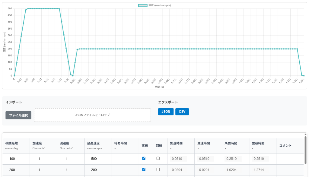 直線運動や回転運動の速度プロファイルを簡単に作成できるWebアプリです。移動距離、加速度、減速度、最高速度を入力し、単位を自由に選択してグラフを生成できます。